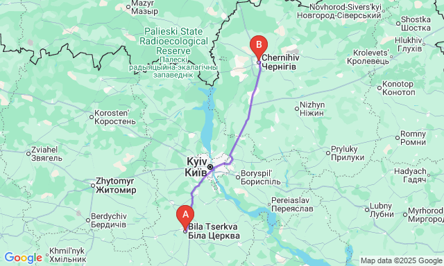 Over 5 buses daily from Bila Tserkva to Chernihiv — a trip every 89 minutes. 8 carriers, tickets from 950 UAH.