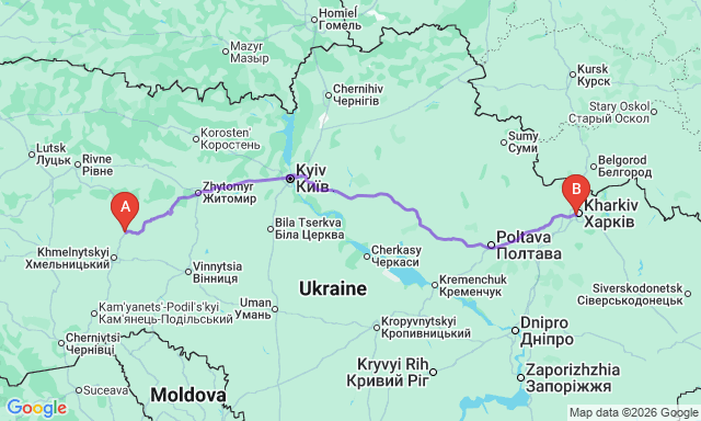 How long is the trip Kharkiv — Starokostiantyniv?