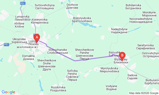 Over 6 buses daily from Lozova to Blyznyuky — a trip every 80 minutes. 11 carriers, tickets from 52 UAH.