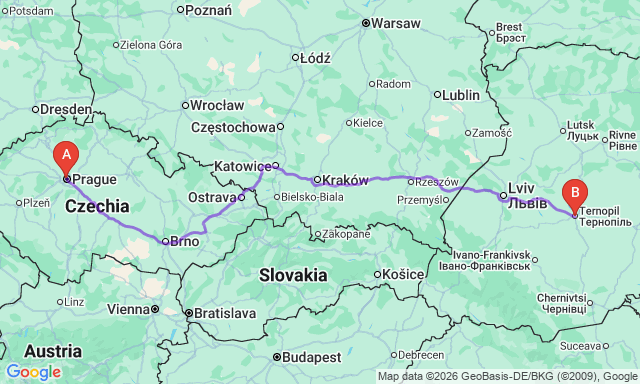Over 20 buses daily from Ternopil to Prague — a trip every 59 minutes. 26 carriers, tickets from 1 550 UAH.