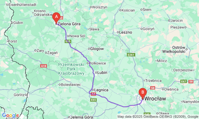 How long is the trip Zielona Góra — Wroclaw?