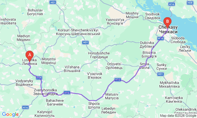 Сколько длится поездка Черкассы — Лысянка?
