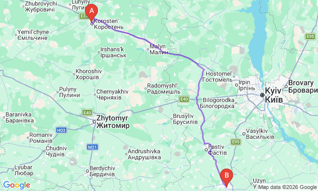 Сколько длится поездка Коростень — Белая Церковь?