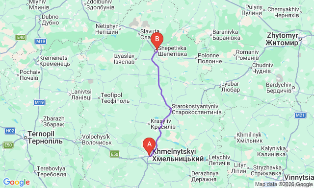 Сколько длится поездка Шепетовка — Хмельницкий?