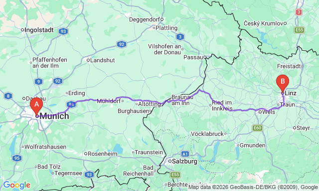 Скільки триває поїздка Линц — Мюнхен?