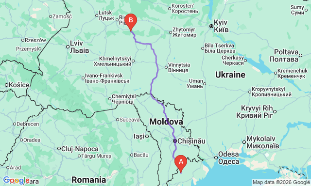 Час у дорозі займає від 1 год 15 хв до 2 год. Відстань між містами — 630 км км.